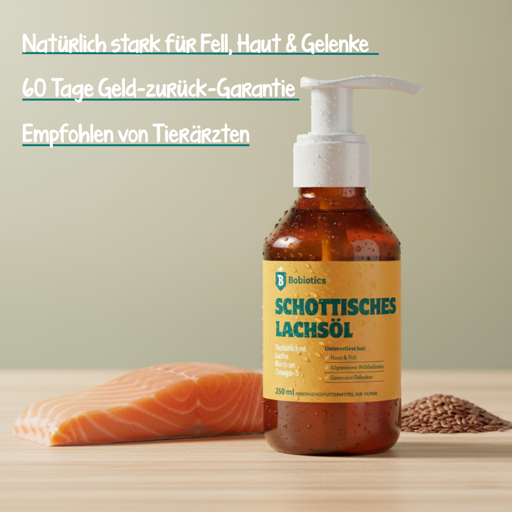 Viele Hundehalter bemerken bereits nach 2 bis 4 Wochen ein glänzenderes Fell, weniger Haarausfall und geschmeidigere Gelenke. Das Öl ist reich an natürlichen Omega-3-Fettsäuren (EPA und DHA), die Haut, Fell, Gelenke und das Immunsystem unterstützen. Hergestellt in einer GMP+ zertifizierten Umgebung.
